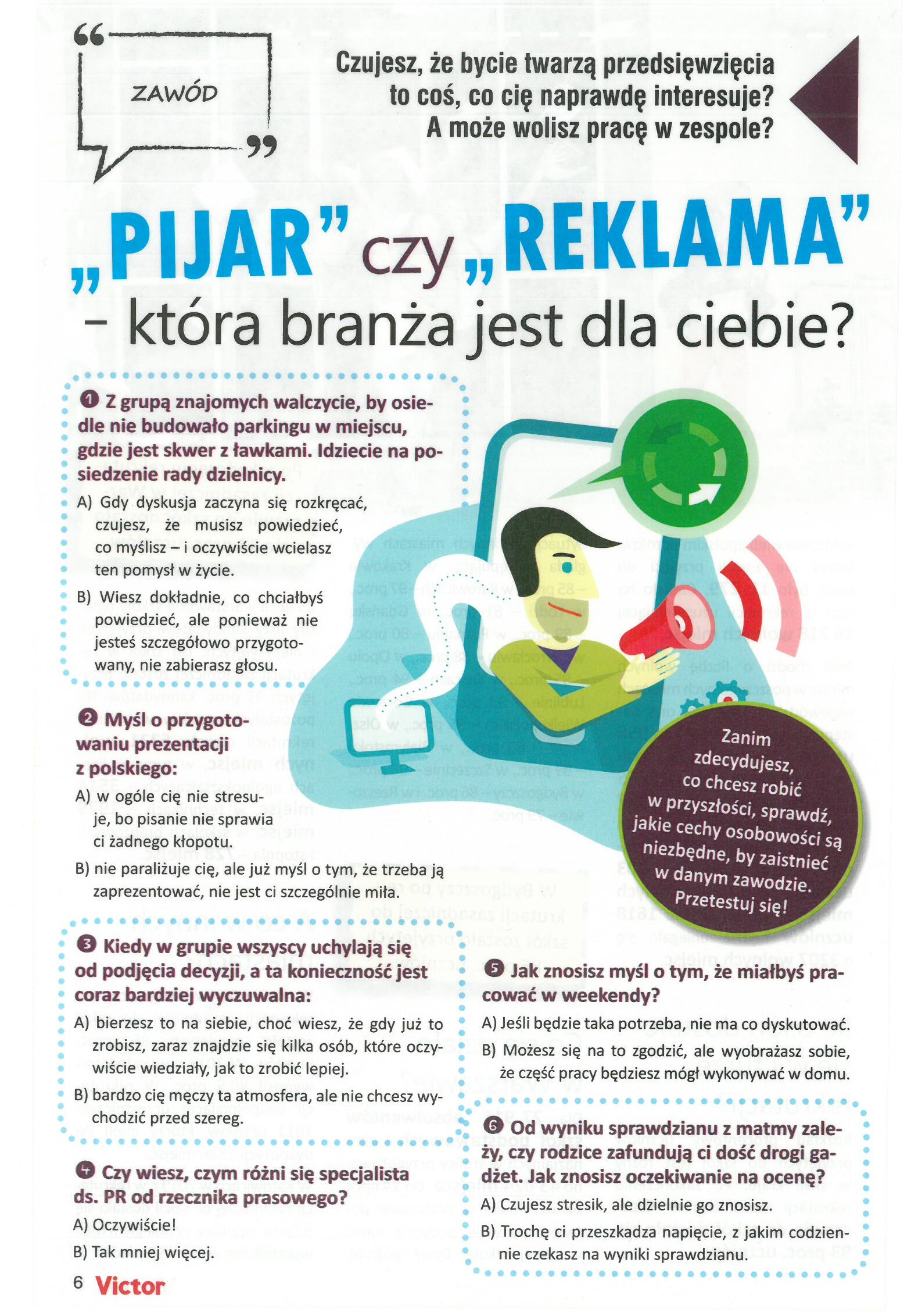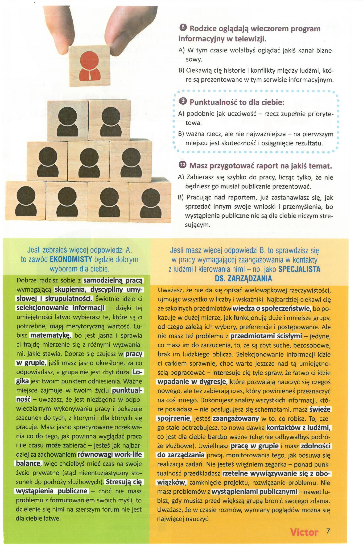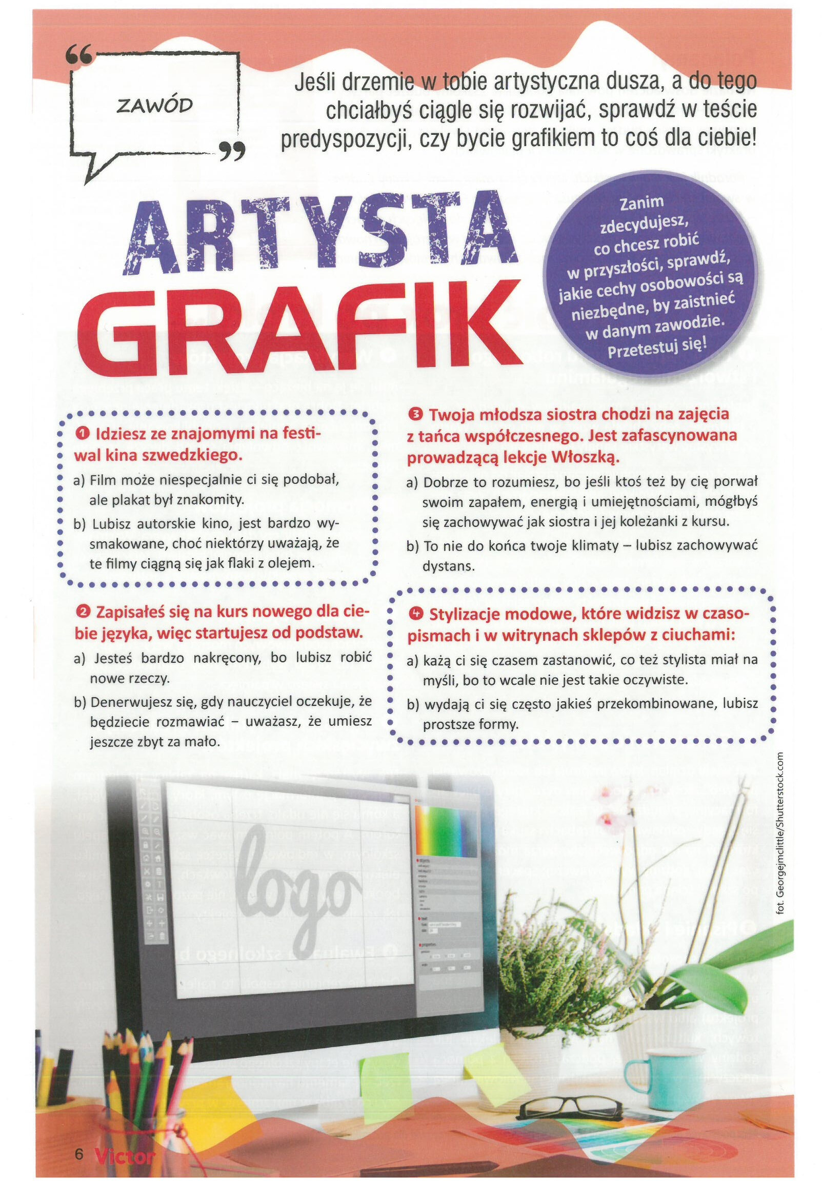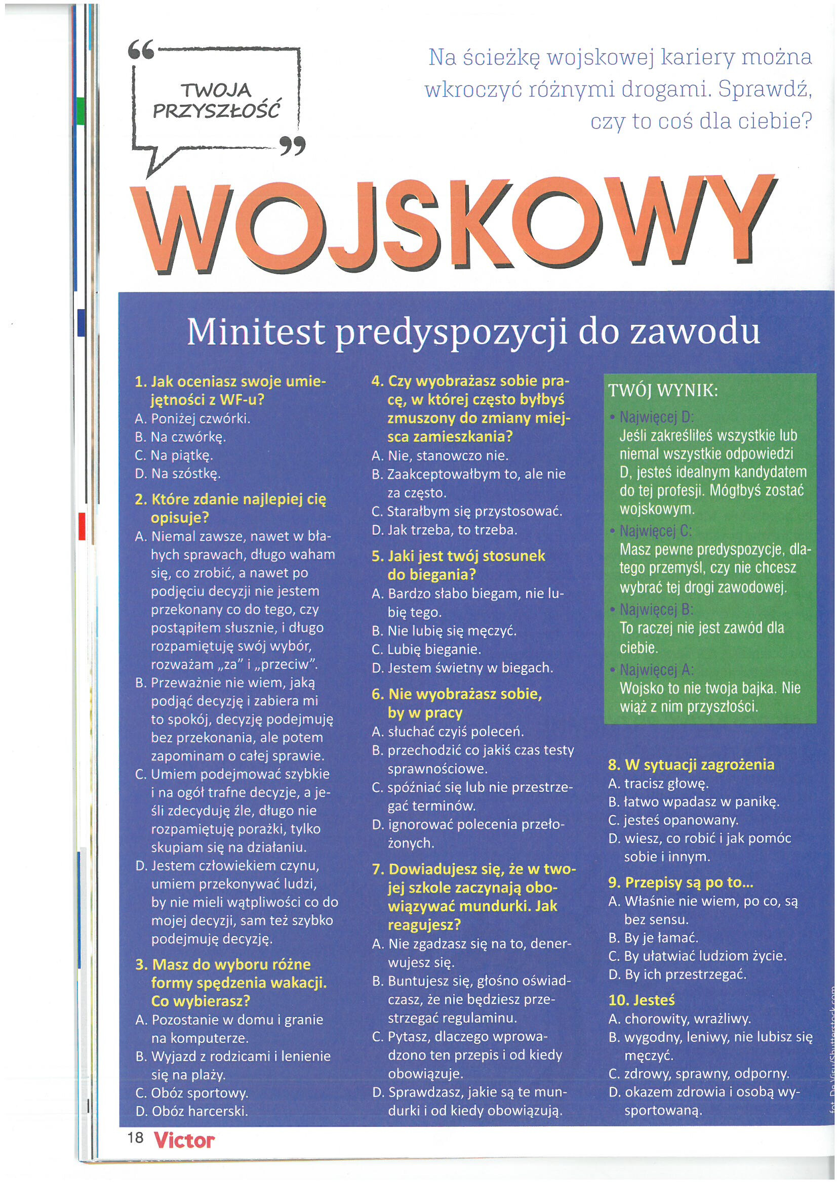 Jeśli rozważasz wybór szkoły, to mogą pomóc Ci testy predyspozycji zawodowych, które dzięki wydawnictwu Victor prezentujemy poniżej. Możesz wybrać interesujące Cię zawody umieszczone w załączonych grafikach i zrobić testy. Życzymy powodzenia i dobrej zabawy.