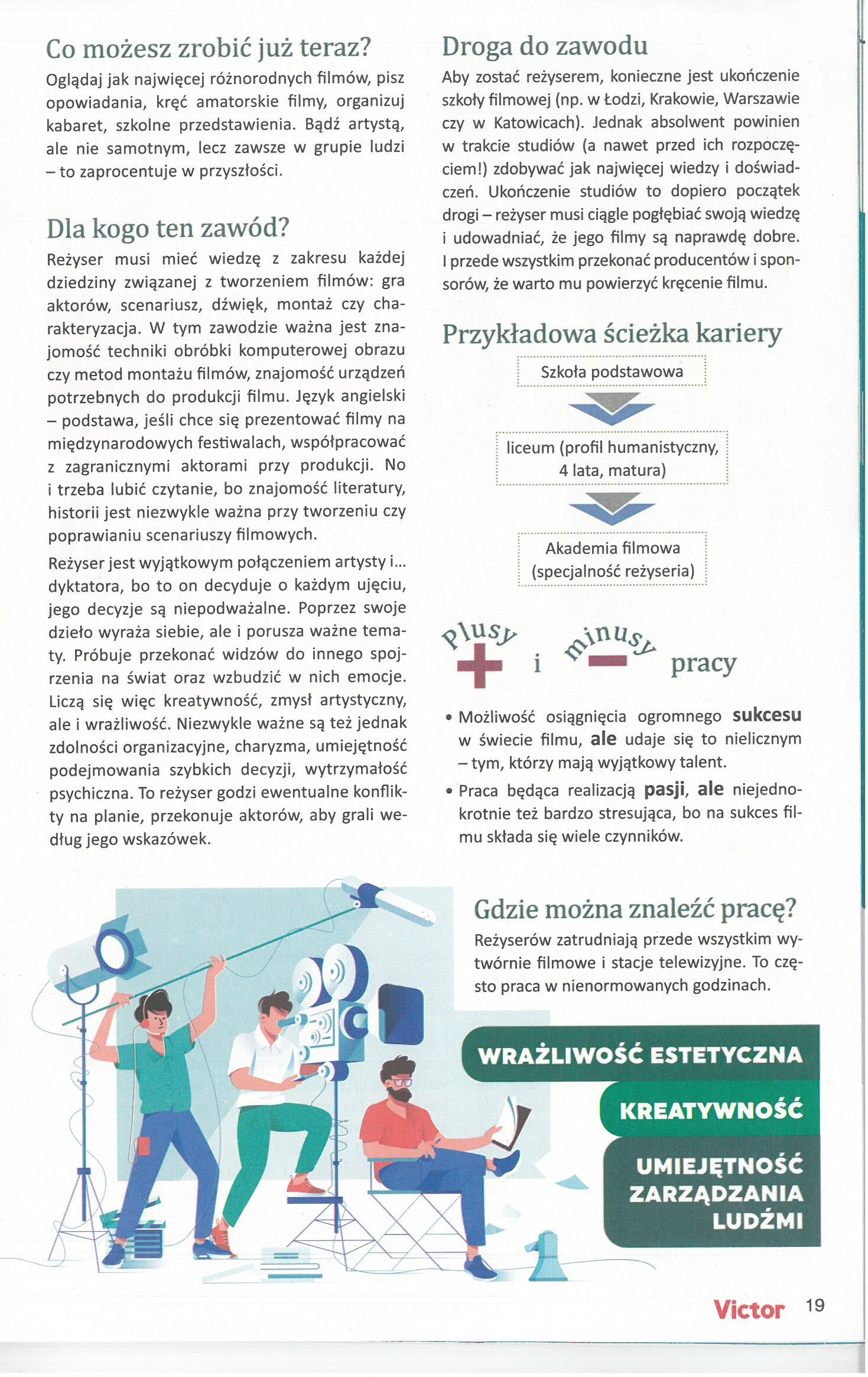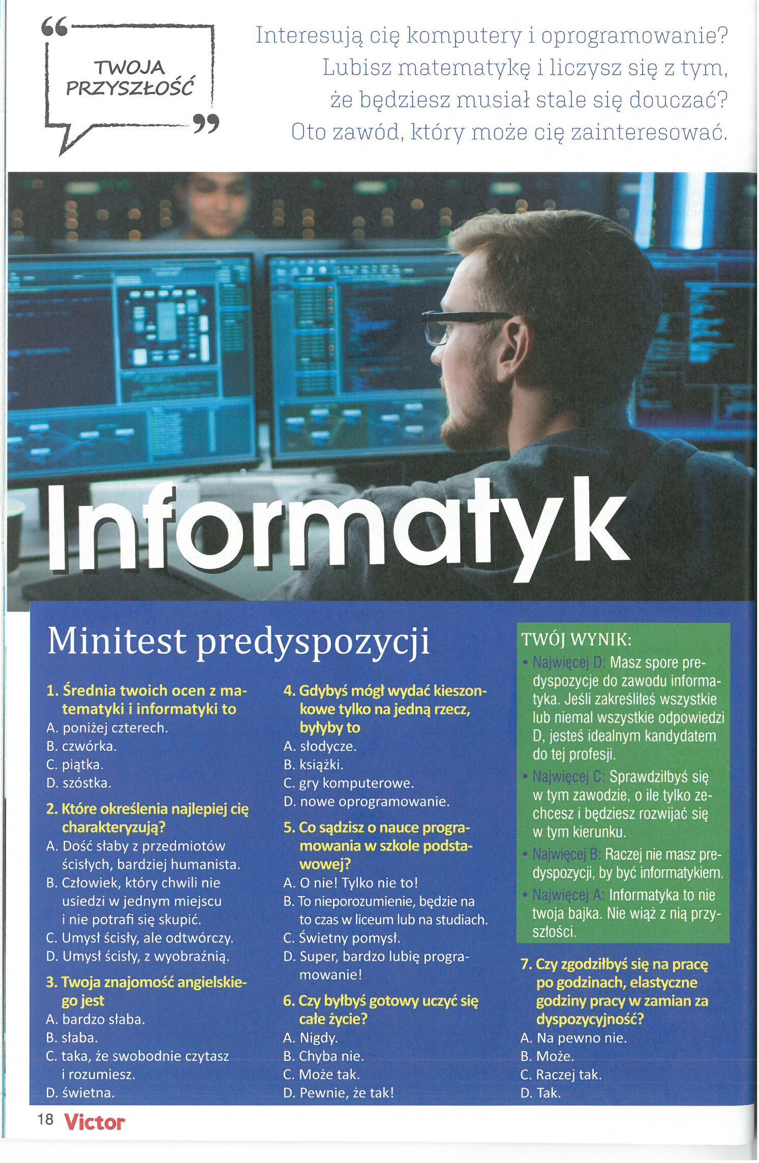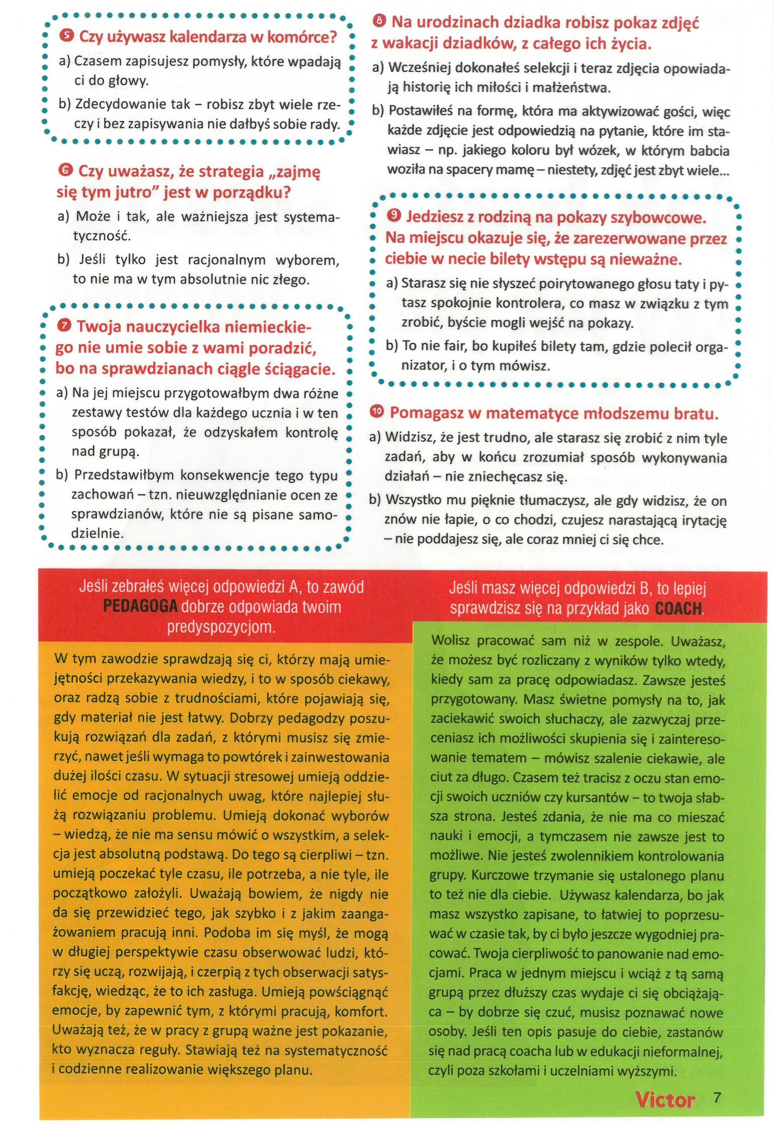 Jeśli rozważasz wybór szkoły, to mogą pomóc Ci testy predyspozycji zawodowych, które dzięki wydawnictwu Victor prezentujemy poniżej. Możesz wybrać interesujące Cię zawody umieszczone w załączonych grafikach i zrobić testy. Życzymy powodzenia i dobrej zabawy.