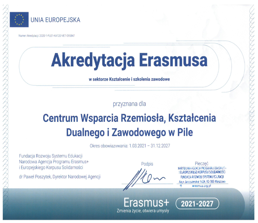 Centrum Wsparcia Rzemiosła, Kształcenia Dualnego i Zawodowego w Pile zaprasza szkoły średnie, które chciałyby wysłać uczniów na praktykę zawodową za granicę oraz nauczycieli w celu „job shadowing” do wzięcia udziału w rekrutacji w ramach projektu Erasmus+ Kształcenie i szkolenie zawodowe Akcja 1- Mobilność osób w dziedzinie kształcenia i szkolenia zawodowego.