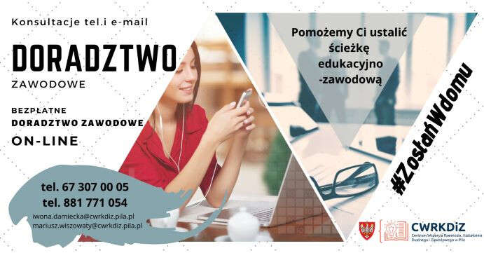 Dostosowując się do aktulnych możliwości oraz potrzeb, nasi doradcy zawodowi proponują Wam bezpłatne konsultacje zawodowe bez wychodzenia z domu. Zapraszamy do rozmowy telefonicznej lub konsultacji e-mail w tematach: