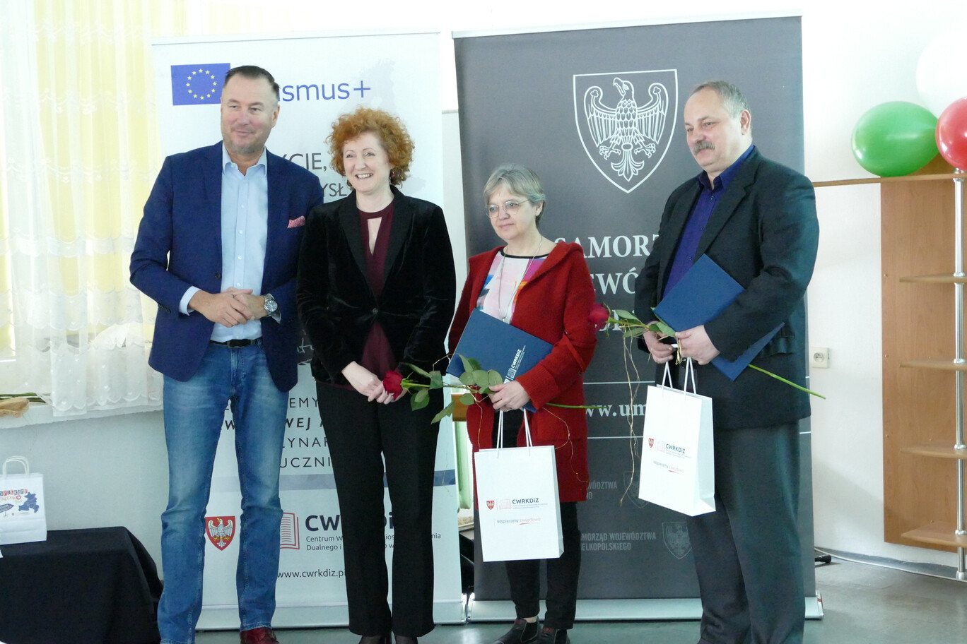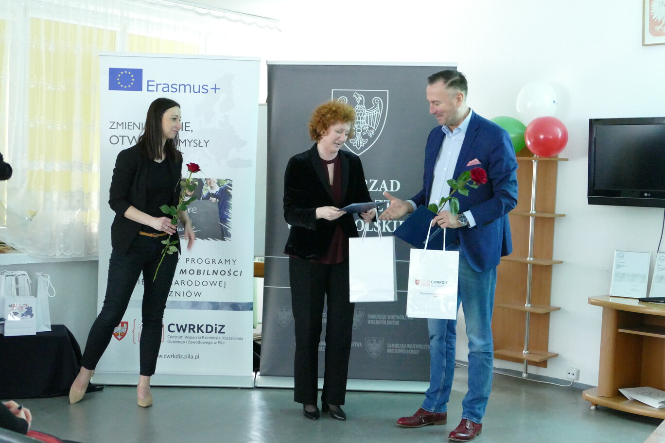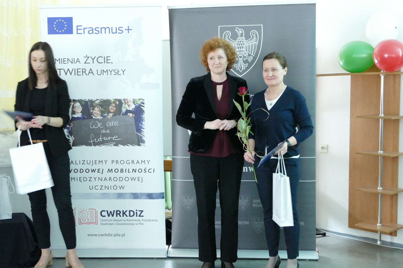 Podczas Dnia Włoskiego w dniu 09.04.2022 r. Dyrektor CWRKDiZ w Pile Ewa Krupka-Zaręba wręczyła uczniom zaświadczenia o udziale w projekcie. Przekazano podziękowania instytucji i organowi prowadzącemu szkołę a także osobom bezpośrednio zaangażowanym w realizację wyjazdu, a byli to m.in. – Dyrektor ZSE Pani Magdalena Michalska, opiekunowie grupy uczniów: Pani Anna Michalska, Pan Henryk Liszkiewicz, Pan Marek Kamiński (jednoczesny Członek Zarządu Powiatu) oraz szkolny koordynator projektu Pani Anita Taterka.