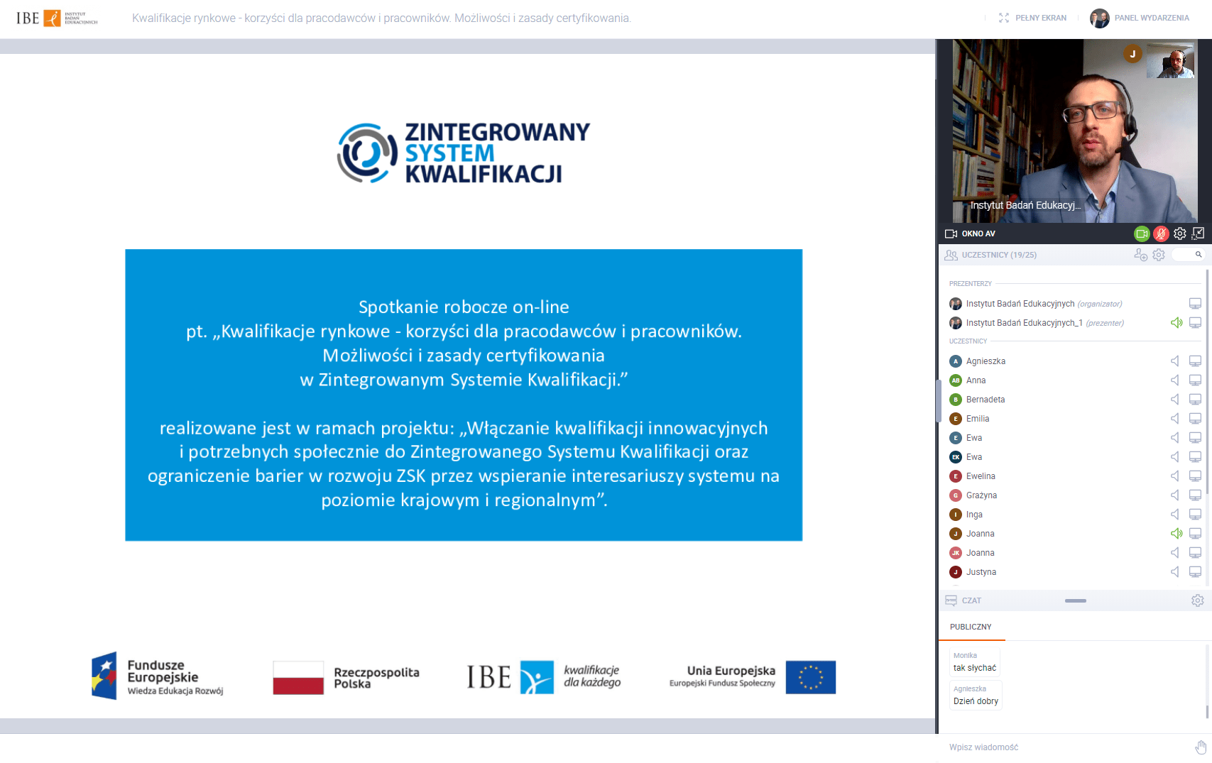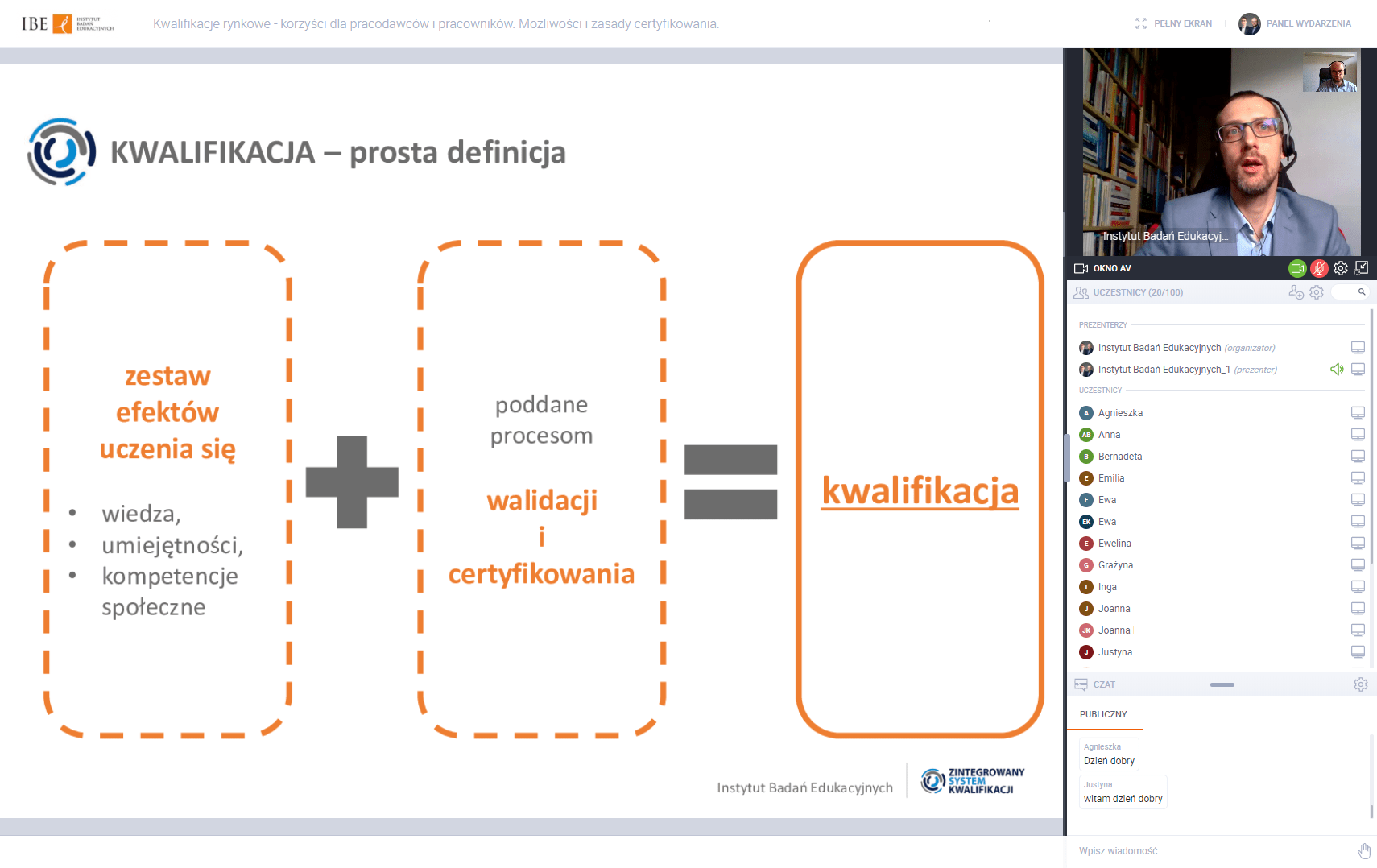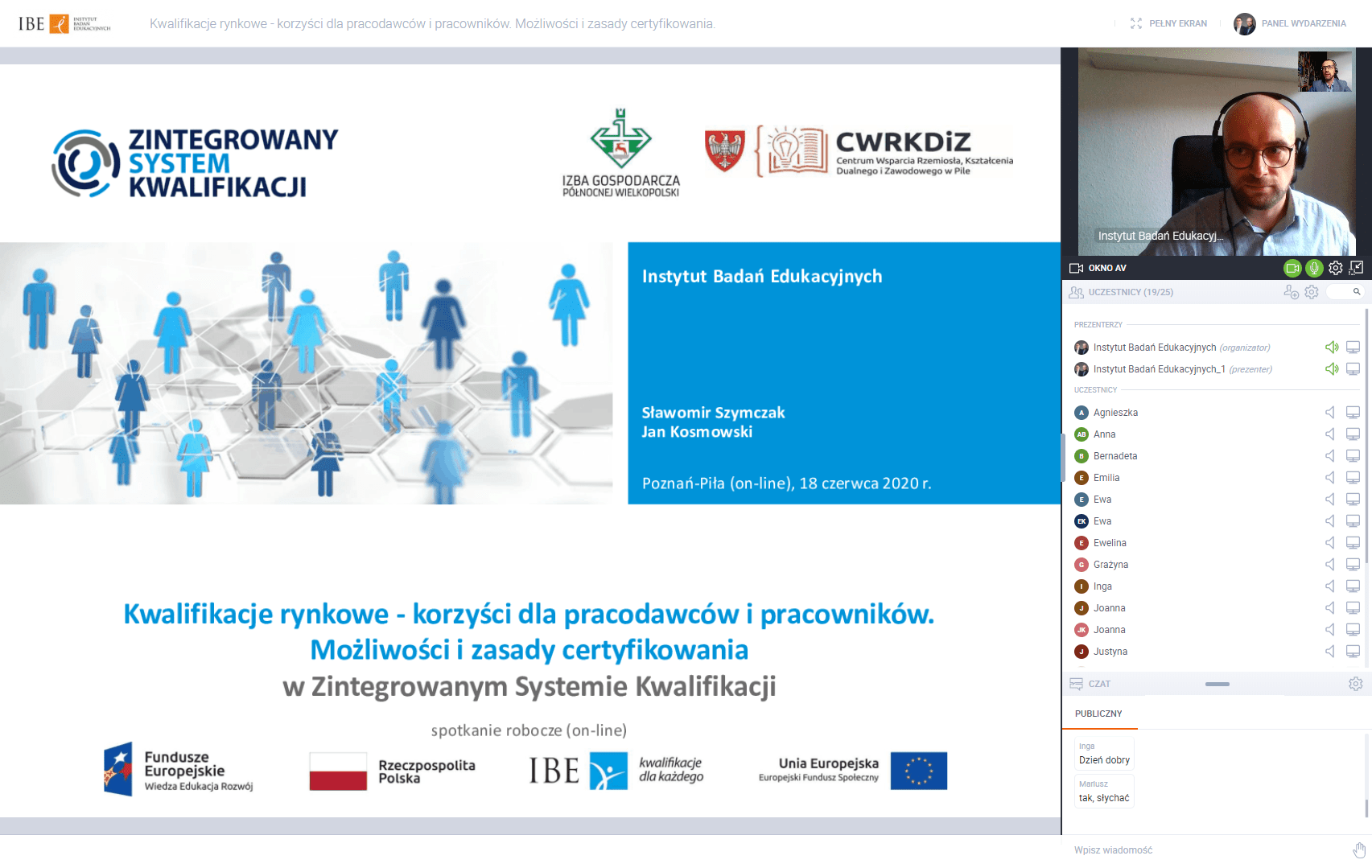 Zorganizowane przez nasze Centrum i przy współudziale IGPW w Pile spotkanie robocze pt. „Kwalifikacje rynkowe - korzyści dla pracodawców i pracowników odbyło się 18.06.2020 w wirtualnej sali. Spotkanie poprowadzili przedstawiciele Instytutu Badań Edukacyjnych Sławomir Szymczak i Jan Kosmowski.