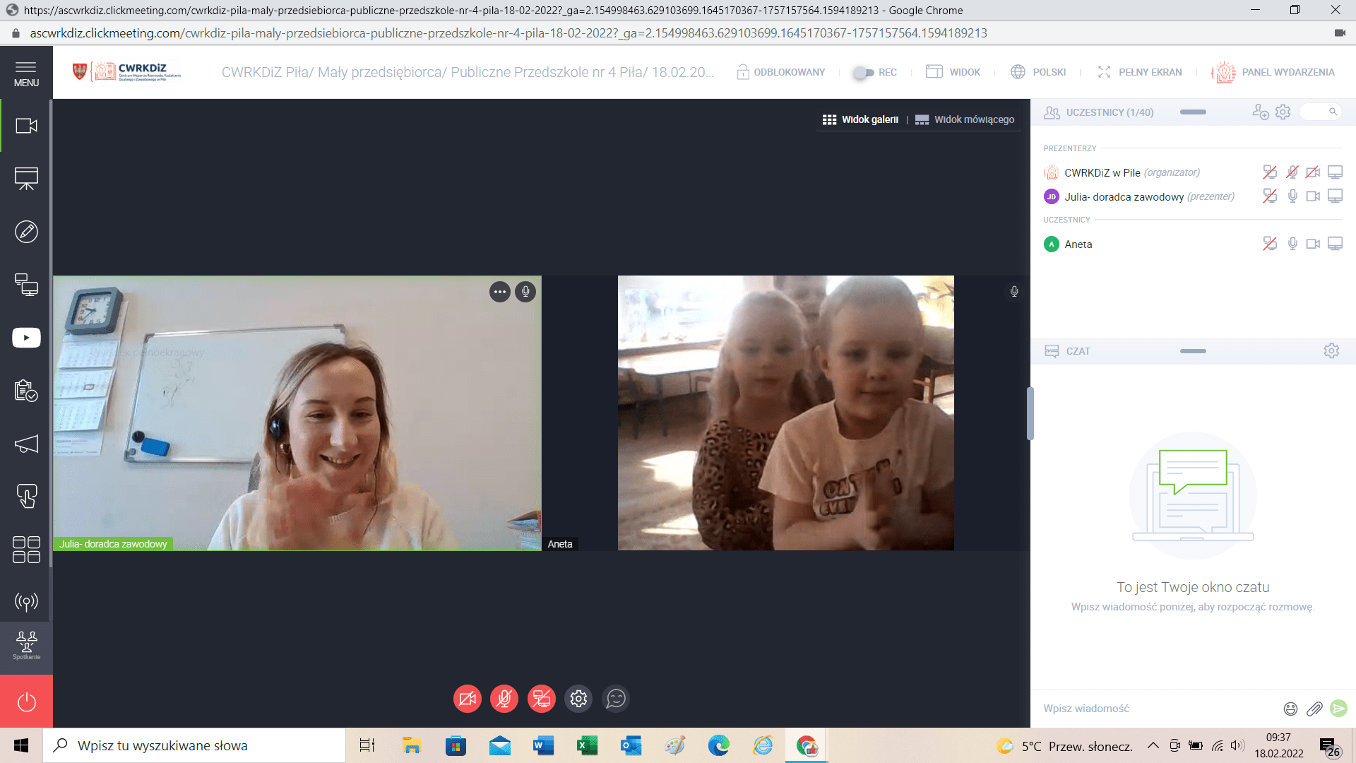 Dnia 18.02.2022 r. doradca zawodowy CWRKDiZ w Pile Julia Kuśniar- Zielińska odwiedziła wirtualnie Publiczne Przedszkole nr 4 w Pile, przeprowadzając warsztat pt. „Mały przedsiębiorca- Zawodowe brzdące”. Spotkaliśmy się z grupą Zajączków, które świetnie poradziły sobie w odpowiadaniu na pytania z testu wiedzy