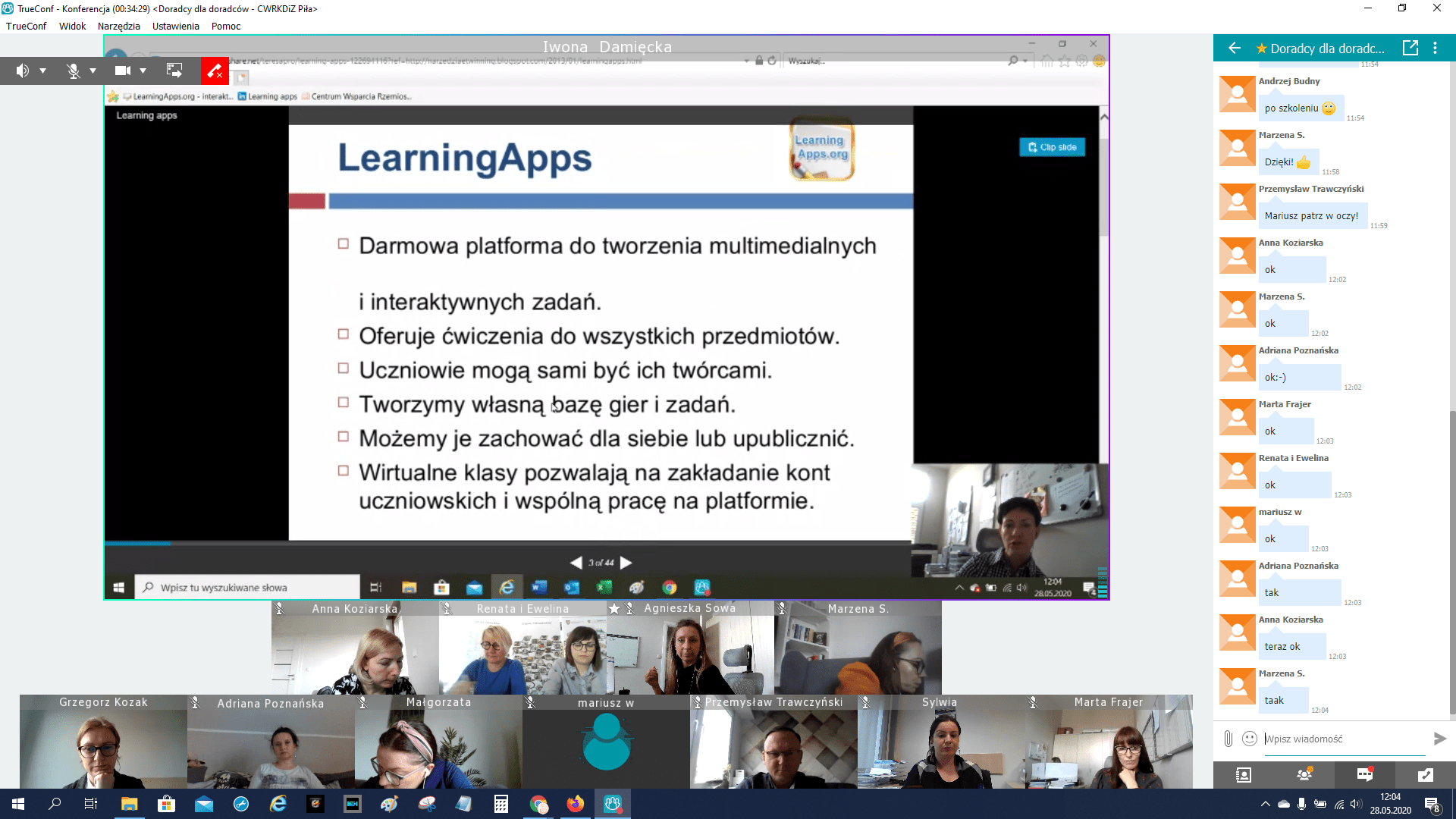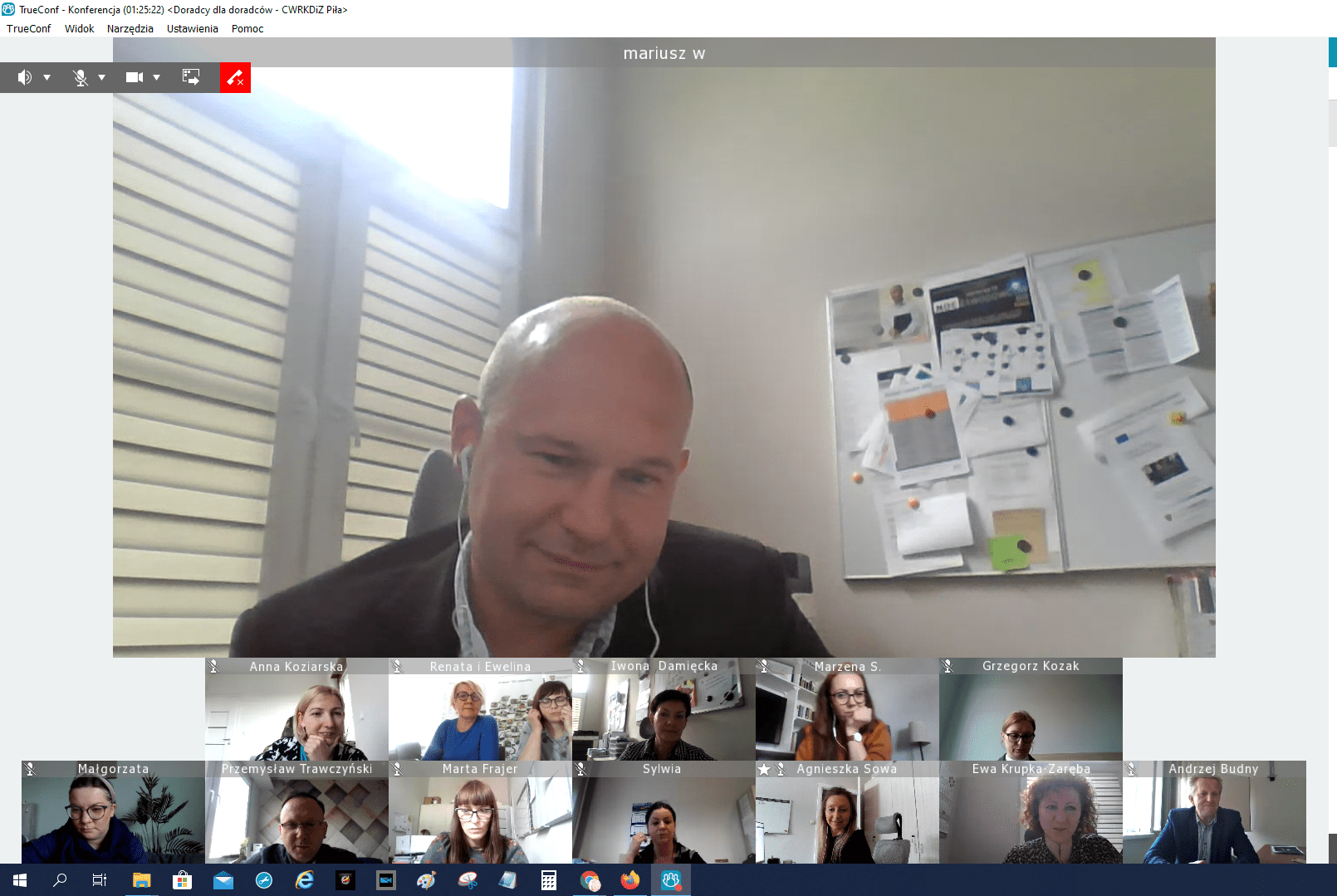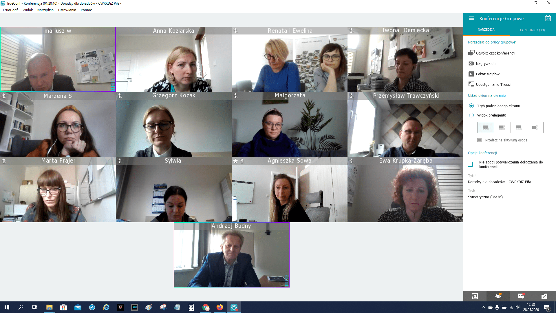 W drugiej części uczestnicy przełączyli się na platformę TrueConf gdzie po przywitaniu przez dyrektora CWRKDiZ w Pile we wspólnym, wąskim gronie zostały poruszone aktualne problemy w pracy doradców zawodowych, związane z ograniczeniami wynikającymi z sytuacji epidemiologicznej w kraju. Doradcy zawodowi ze wszystkich centrów zaprezentowali swoje osiągnięcia, propozycje i sposoby radzenia sobie w tej trudnej i nieprzewidywalnej wcześniej sytuacji. Podczas spotkania zostały zaprezentowane narzędzia online stworzone przez doradcę zawodowego CWRKDiZ w Pile - p. Iwonę Damięcką.