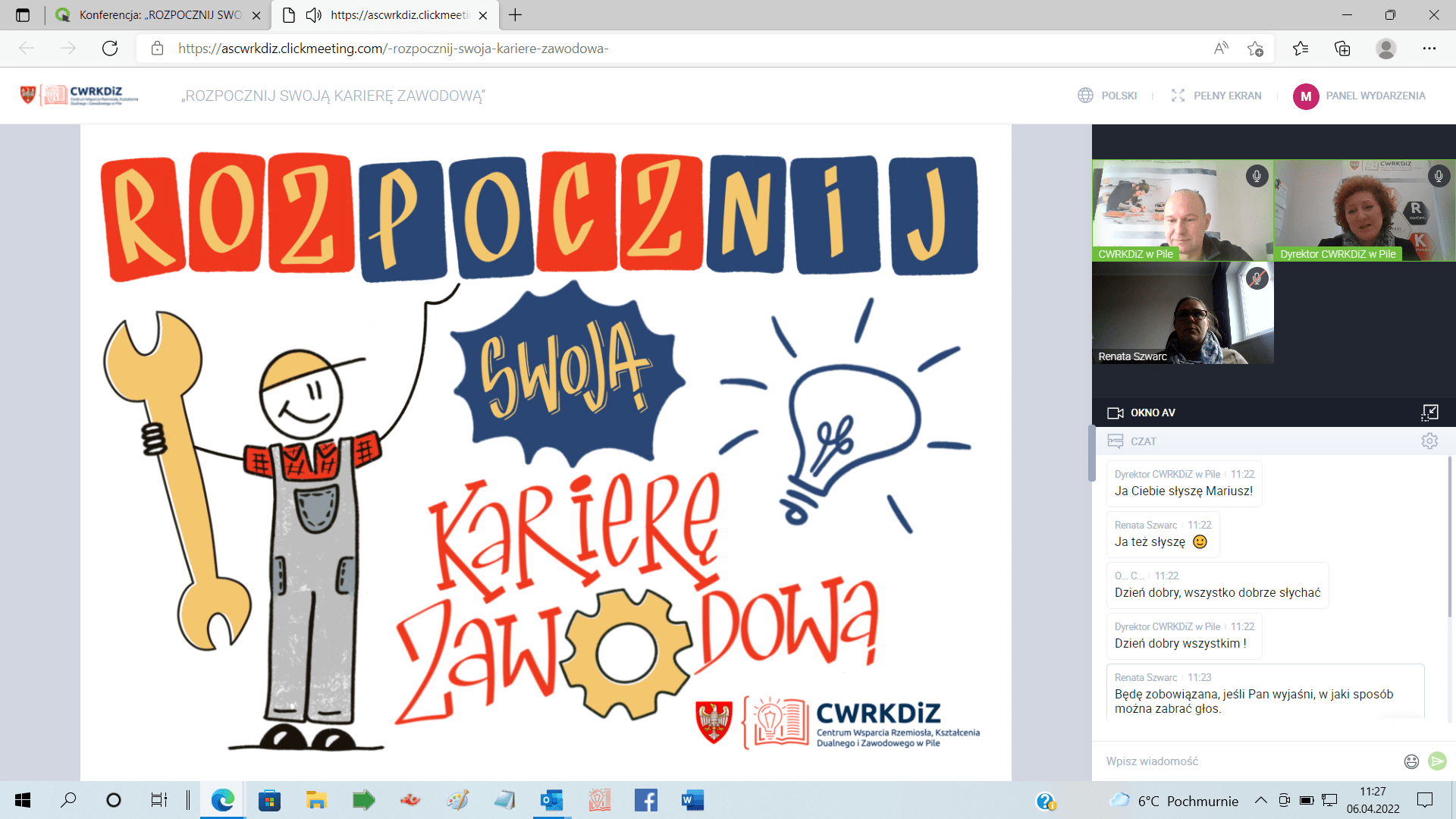 Dnia 06.04.2022 roku odbyło się kolejne spotkanie on-line z cyklu „ROZPOCZNIJ SWOJĄ KARIERĘ ZAWODOWĄ” dla uczniów i nauczycieli ostatnich klas branżowych z przedsiębiorcami.