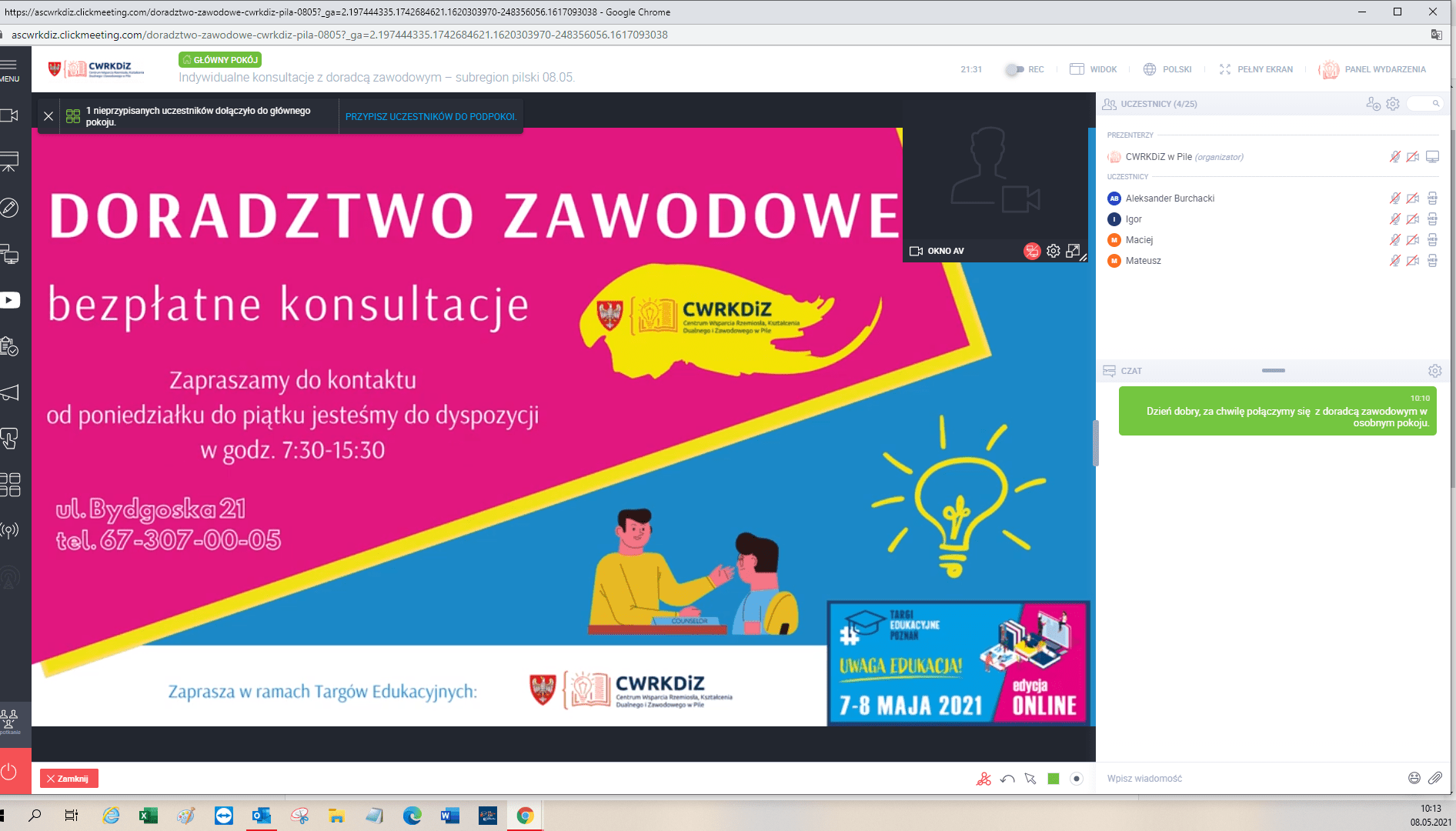 Kolejny webinar „Dlaczego warto wybrać szkołę uczącą zawodu?” przeprowadził nasz doradca zawodowy, który poruszył ważny temat „za” i „przeciw” nauki w branżowej szkole zawodowej, przedstawił różne ścieżki edukacyjne oraz szeroki wachlarz zawodów. Oba warsztaty były adresowane do uczniów klas 7 i 8 szkół podstawowych, a także ich rodziców. Przez dwa dni Targów prowadzono konsultacje z doradztwa zawodowego zarówno on-line, jak i stacjonarnie w siedzibie Centrum. Celem było wsparcie w planowaniu dalszej ścieżki rozwoju edukacyjnego i zawodowego, pomoc w wyborze szkoły; przeprowadzano testy predyspozycji zawodowych.