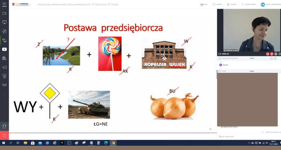 W pierwszej części warsztatu uczniowie zapoznali się z postawami przedsiębiorczymi przedstawionymi w formie rebusów. W drugiej części rozwiązywali test „Czy jesteś osobą przedsiębiorczą?". Na zakończenie zajęć prowadząca warsztat przybliżyła w skrócie uczestnikom jednostkę #CWRKDiZ w Pile zachęcając do korzystania z materiałów i narzędzi pomocnych w rozpoznawaniu własnych zasobów podczas planowania kariery zawodowej. Bardzo dziękujemy za możliwość przeprowadzenia zajęć i aktywność mimo wczesnej godziny