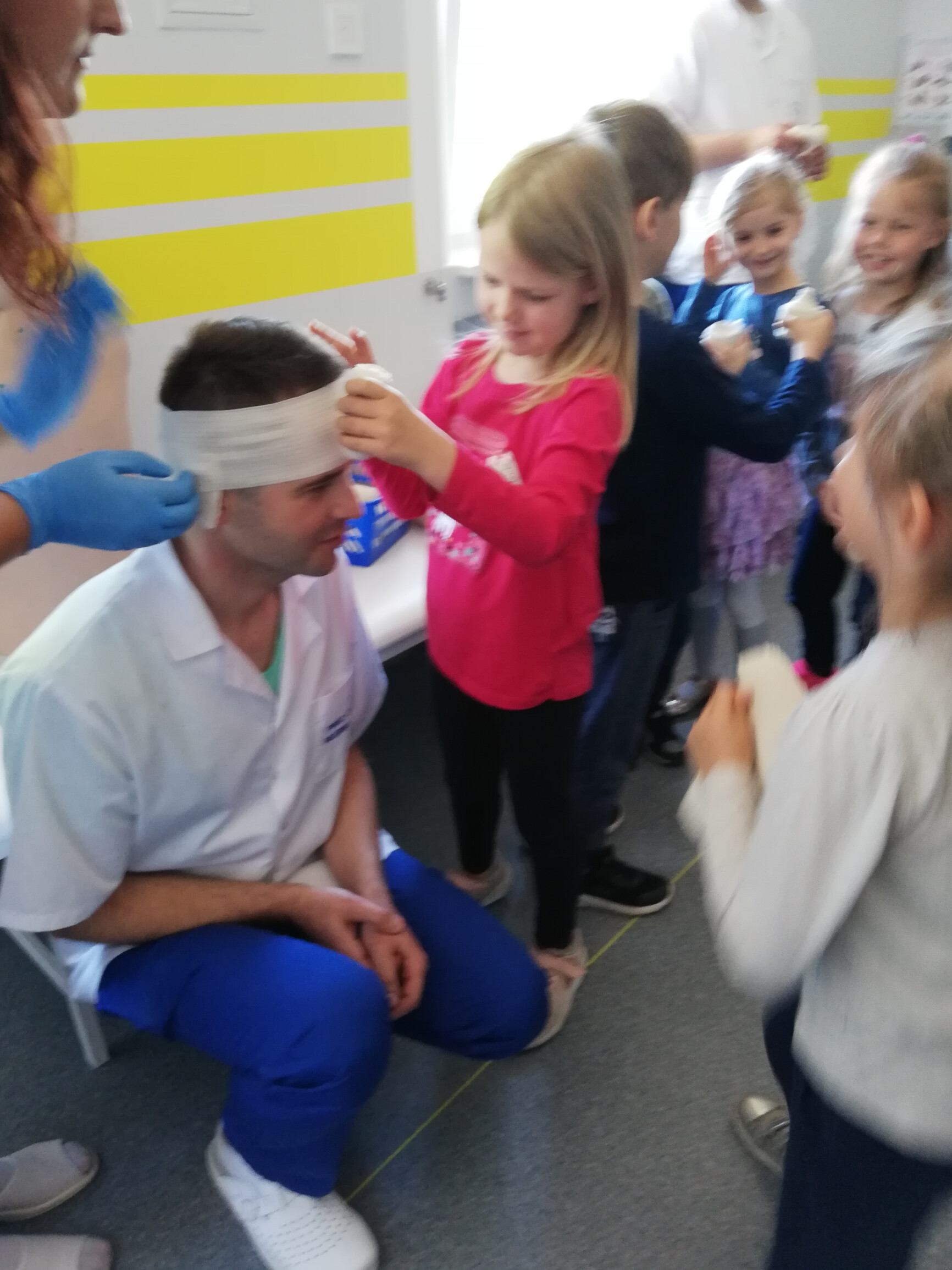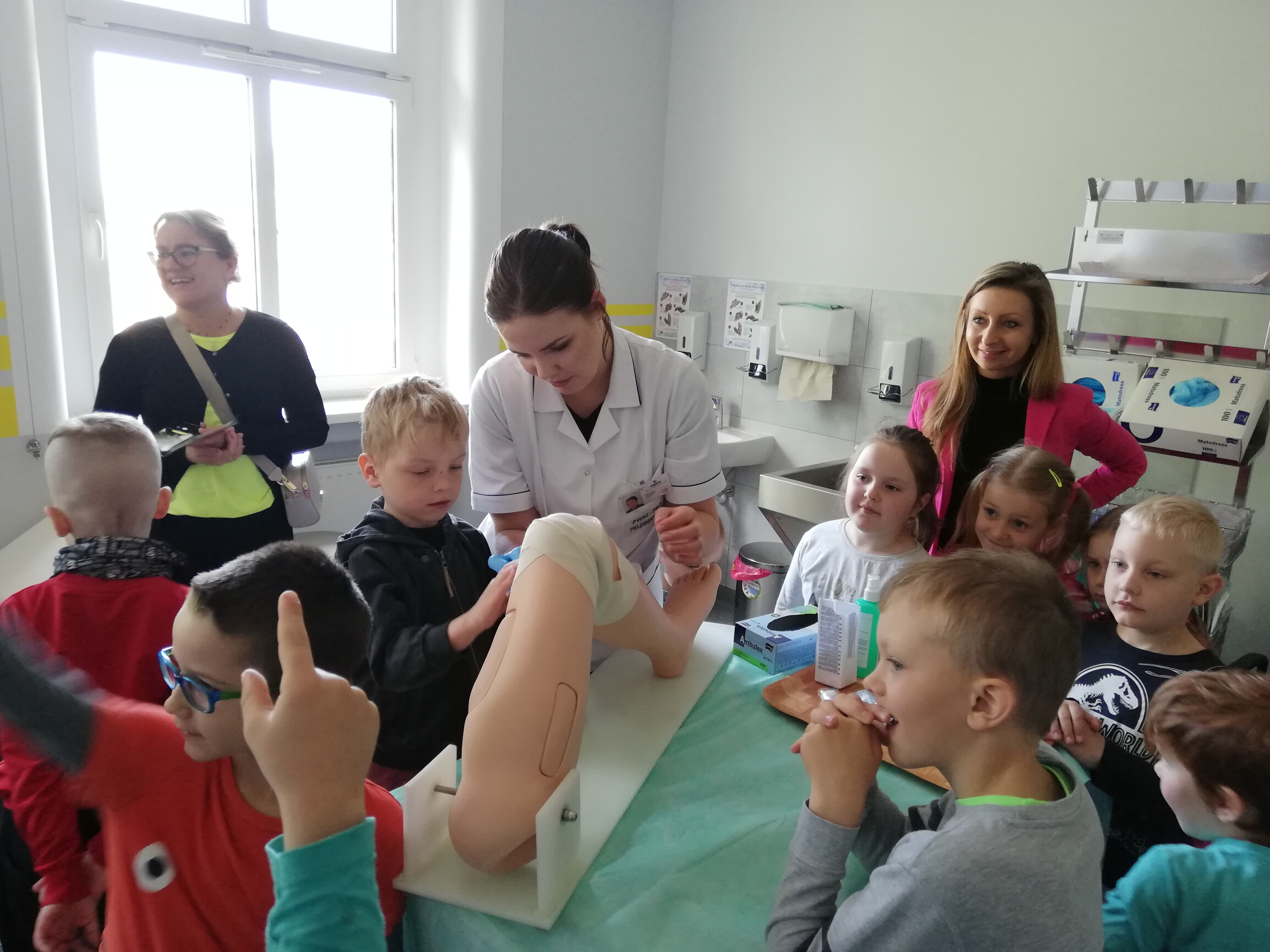 W nowootwartym Centrum Symulacji Medycznych na PWSZ w Pile w Zakładzie Pielęgniarstwa w poszczególnych, bogatowyposażonych salach symulacyjnych do ćwiczeń przedszkolaki mogły własnoręcznie zabandażować ranę, zmierzyć temperaturę, ciśnienie, posłuchać bicia serca, poznać i przećwiczyć elementy pierwszej pomocy czy przyjrzeć się nowoczesnej aparaturze monitorującej stan chorego przy szpitalnym łóżku. Atrakcji był cały szereg, a dzieci były bardzo aktywne i ciekawe wszystkiego. Na koniec otrzymały kolorowanki o zawodach oraz odblaski z numerem alarmowym pogotowia aby pamiętały jak wzywać pomoc w nagłej sytuacji. Bardzo dziękujemy za możliwość przeprowadzenia tak kreatywnych zajęć na PWSZ w Pile.
